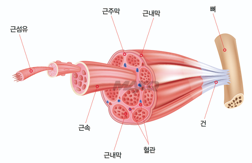 | 근원섬유(Myofibril) | 근섬유 내부의 세포소기관 | 근육 수축의 핵심 단위 |