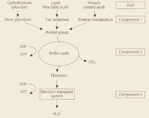 중요! 아래 그림은 유산소성 대사 시스템을 간략하게 도식화 해놓은 그림입니다. 탄수화물(glucose), 지방(fatty acid), 단백질(amino acid)이 연료로 작용하고 이들은 먼저 미토콘드리아에서 아세틸코에이(Acetyl-CoA)의 형태로 전환됩니다. 전환된 아세틸코에이는 크렙스 회로(krebs cycle)로 유입되어 ATP를 생성하고 전자를 포함한 NADH와 FADH2라는 물질을 만들어 마지막 단계인 전자전달계(electron transport system, ETC)로 보내게 됩니다. 전자전달계에서는 산소를 활용해서 ATP를 생성하게 됨으로써 최종적으로 유산소성 대사가 완성됩니다.