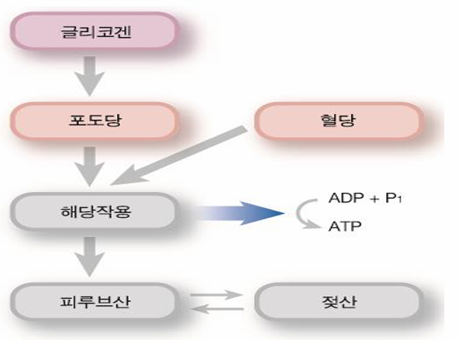 - 해당과정은 30초~2분 동안의 중간 지속 운동에서 가장 중요한 에너지 시스템으로 작용합니다.