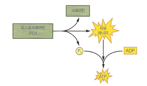 - 1단계: PCr → 크레아틴 + Pi (PCr을 creatine과 Pi으로 분해한다.)