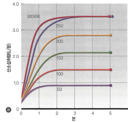 운동 시작 초기에는 산소 섭취가 운동 강도를 따라잡기 위해 빠르게 증가하지만, 이후 안정 상태에 도달하면서 정체기 즉, 항정상태에 이르게 됩니다. 아래 그래프는 운동 시간에 따른 산소섭취량의 변화를 운동강도별로 구분해서 나타낸 그래프입니다. 사이클 에르고미터를 이용해서 와트(watt)로 운동강도를 조절해서 각 운동강도에 따른 산소섭취량을 비교했을때, 운동강도가 높을 수록 초기 산소섭취량이 급격히 증가하지만 일정 시점 이후 모두 항정상태에 돌입하는 것을 알 수 있습니다.