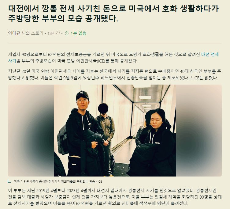 최근 몇년동안 대한민국을 떠들석하고 불안하게 만든 사건이 있었죠. 몇몇 유명 연예인들도 이 사기를 당해서 이슈가 되기도 했었는데요, 바로 전세사기입니다. 위에 보이는 기사는 부부 전세사기범들인데요, 90명을 상대로 총 62억원을 가로챈 혐의로 미국에서 체포되었다고 합니다. 참 평범하게 생겨가지고는 다른 사람에 그런 아픔과 피해를 주고 다니다니,,, 반드시 제대로 된 처벌이 이루어지길 바랍니다.