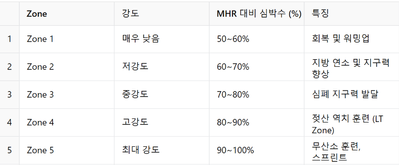심박수 존(Heart Rate Zone)은 최대 심박수(Maximum Heart Rate, MHR)를 기준으로 운동 강도를 단계별로 나눈 것입니다. 일반적으로 Zone 1부터 Zone 5까지 구분하며, 각각의 영역은 신체 대사와 훈련 목표에 따라 다르게 활용됩니다.